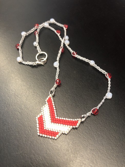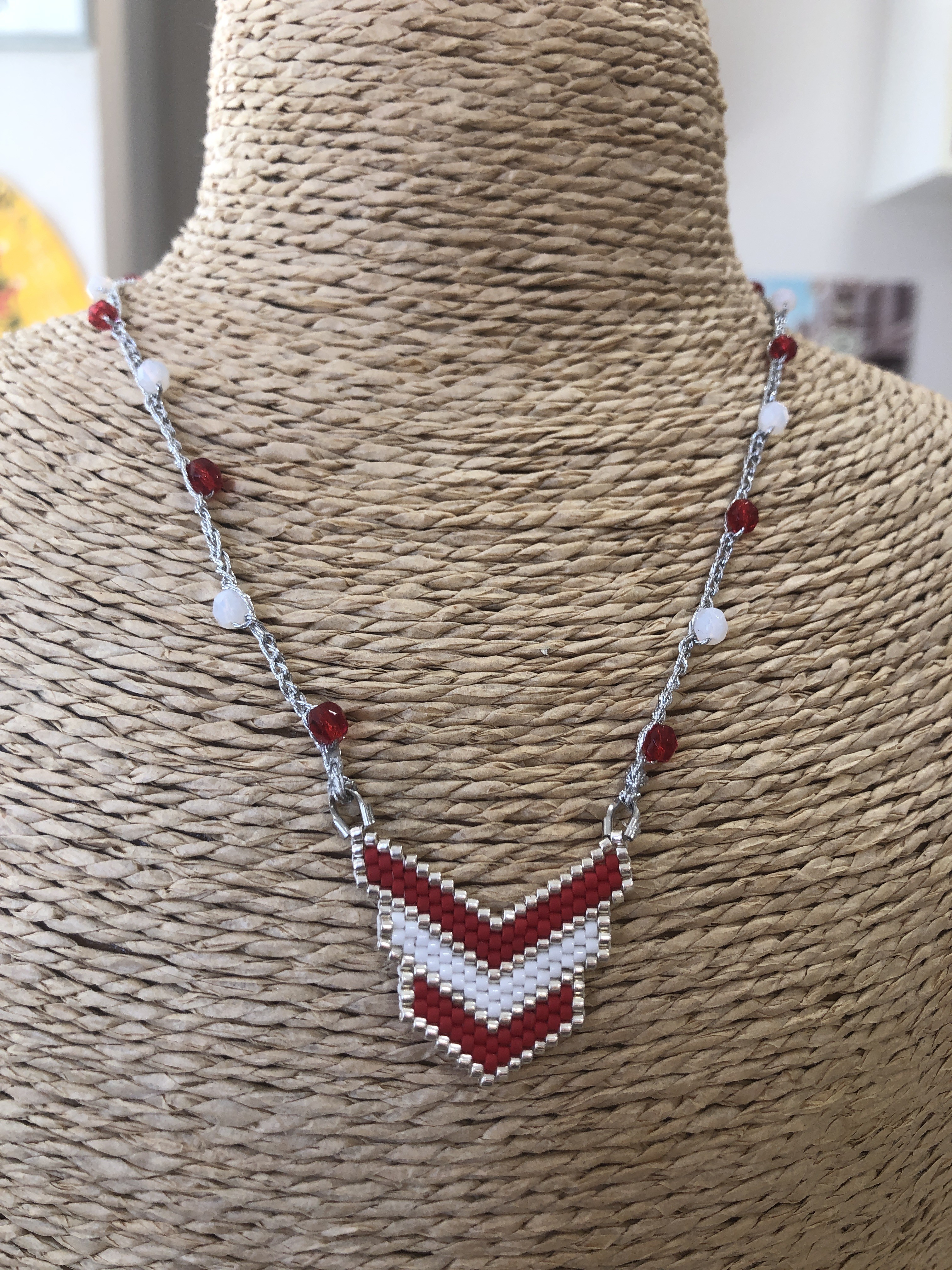 Collier en fil bijou argenté crocheté et agrémenté de perles facettes. Le médaillon a été réalisé à l'aiguille. Fermoir mousqueton en acier inoxydable